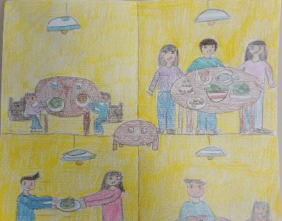Sapete cosa succede mentre mangiamo? Accade una magia, la raccontiamo con questa storia: Il grande tavolo di legno. “C’era una volta Teo, un tavolo di legno, lui non era felice, perché stava solo in una soffitta. Un giorno, un signore lo portò in sala da pranzo. Teo era contento, ma temette di diventare legna per il fuoco e tremava come un budino dalla paura. Quando il signore invitò degli amici a pranzo: mise sul tavolo una bella tovaglia e fiori profumati. Gli amici arrivarono e Teo era felice di vedere cibi diversi e gustosi rappresentanti i loro viaggi. Sentì le loro risate. Capì che ogni pietanza racconta una storia come un libro.