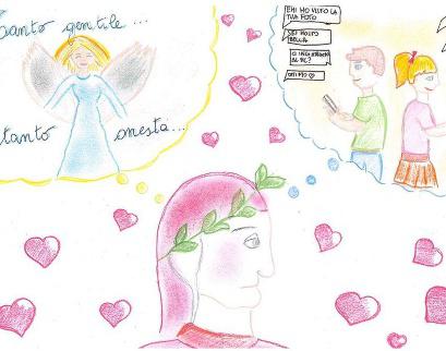 “Tanto gentil e tanto onesta pare la donna mia quand’ella altrui saluta, ch’ogne lingua deven tremando muta, e li occhi no l’ardiscon di guardare”. Quest’anno, tra tanti letterati del nostro percorso di studi, abbiamo conosciuto Dante Alighieri, autore dei meravigliosi versi appena citati. Meravigliosi dopo che con pazienza abbiamo provato a comprenderli, ad interpretarli e a farli rivivere nei nostri sentimenti cercando di immedesimarci in un qualsiasi ragazzo dell’epoca innamorato di una ragazza. Sinceramente in un primo momento abbiamo fatto davvero fatica a pensarli ricchi di sentimento e ammirazione, anzi, ci sono sembrati anacronistici e quasi un po’ ridicoli! Ci siamo chiesti: “Vi immaginate gironzolare in un qualsiasi sabato pomeriggio in passeggiata a rivolgerci con questa modalità alla ragazzina adocchiata al Carnevale che tanto ci piace? Cosa farebbe? Cosa penserebbe?”.