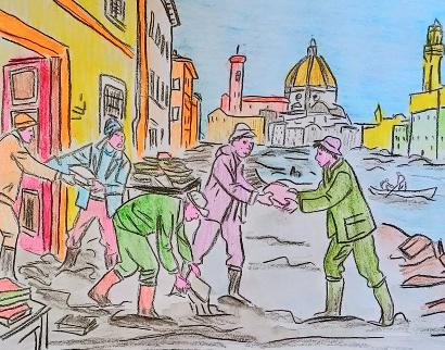 Le immagini dei depositi della Biblioteca Nazionale carichi di fango e del Crocifisso di Cimabue devastato nella Basilica di Santa Croce fecero il giro del pianeta. Eppure, proprio nel momento del massimo sconforto, accadde un miracolo di solidarietà senza precedenti. Migliaia di giovani, provenienti da ogni parte d’Italia e dall’estero, giunsero a Firenze in modo spontaneo per offrire il proprio aiuto. Furono ribattezzati gli “Angeli del Fango”: ragazzi che, immersi nel gelo e nella melma, lavorarono senza sosta per estrarre libri antichi e tele rinascimentali dal degrado, passandosi di mano in mano i volumi nel tentativo disperato di salvarli.